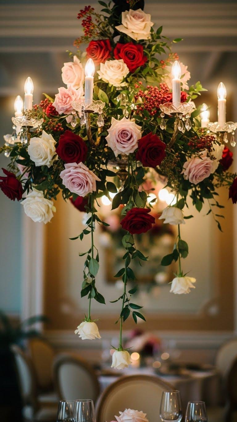 Dress your chandelier in roses to turn ordinary lighting into a romantic centerpiece — weave garlands of mixed blooms and greenery around the arms, let a few budded stems cascade toward the table, and tuck tiny clusters of petals at each light for a soft, glowing halo.