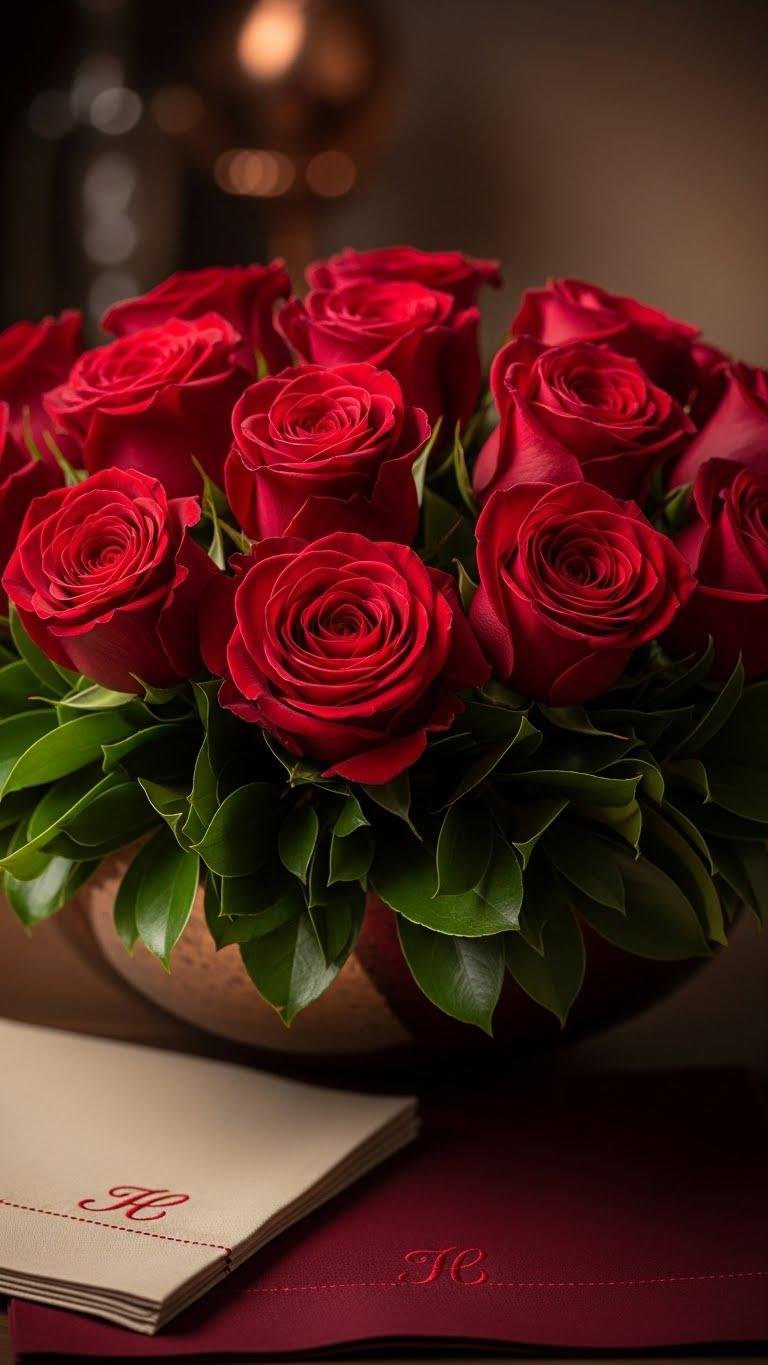 You’ve just admired the fresh, modern energy of greenery and copper; now imagine pivoting to something more timeless: a classic rose arrangement that speaks directly to passion. You’ll place velvet rosebuds in a low, wide vase, let loose foliage frame each bloom, and add subtle scarlet monogramming on napkins or ribbons. The result feels intimate, bold, and utterly free.