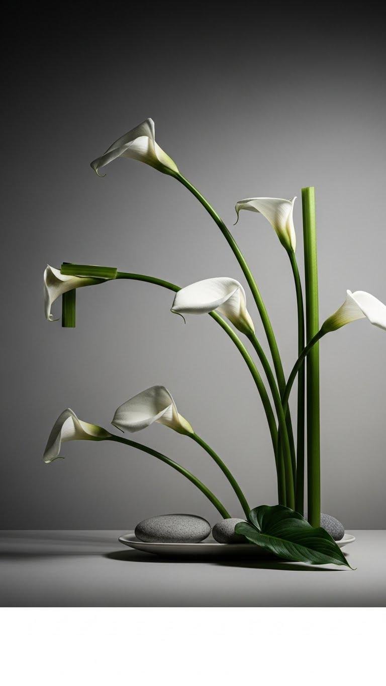Lean into the sleek drama of calla lilies, arranging their long, architectural stems in a low, shallow vessel so each trumpet-like bloom reads like a deliberate stroke of floral sculpture. You’ll favor organic asymmetry, letting some stems arc while others stand erect, crafting minimalist silhouettes that feel free and intentional. Tuck matte stones or a single leaf for contrast; keep lines clean and bold.