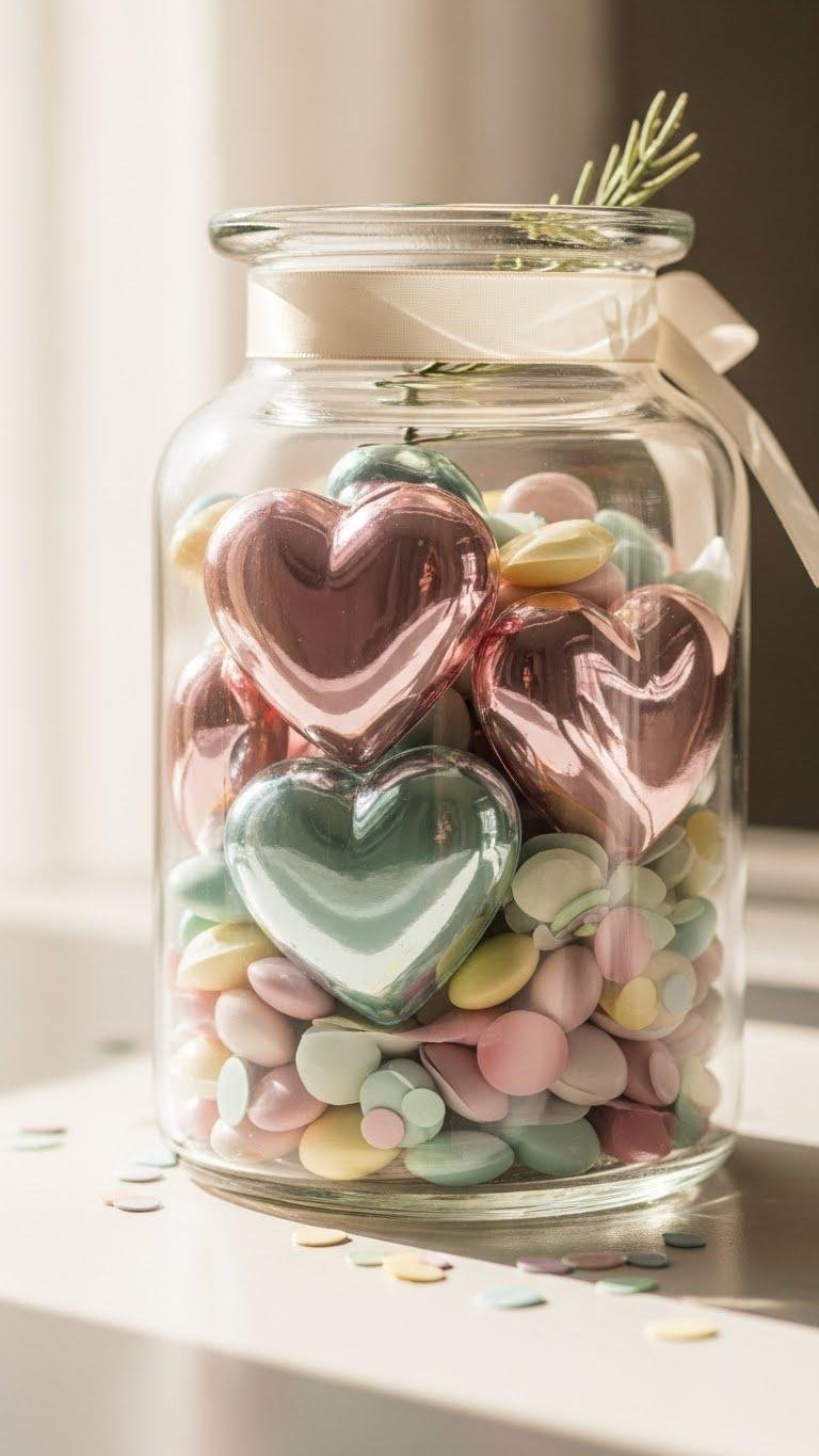 After the sleek, architectural lines of calla lilies, bring in a softer, sweeter vignette by placing a clear apothecary jar at the center of your table and filling it with layered hearts. You’ll mix glass hearts with pastel candy confetti for texture and playful color, then top with a single ribbon or sprig so the jar feels curated, free-spirited, and effortlessly romantic.