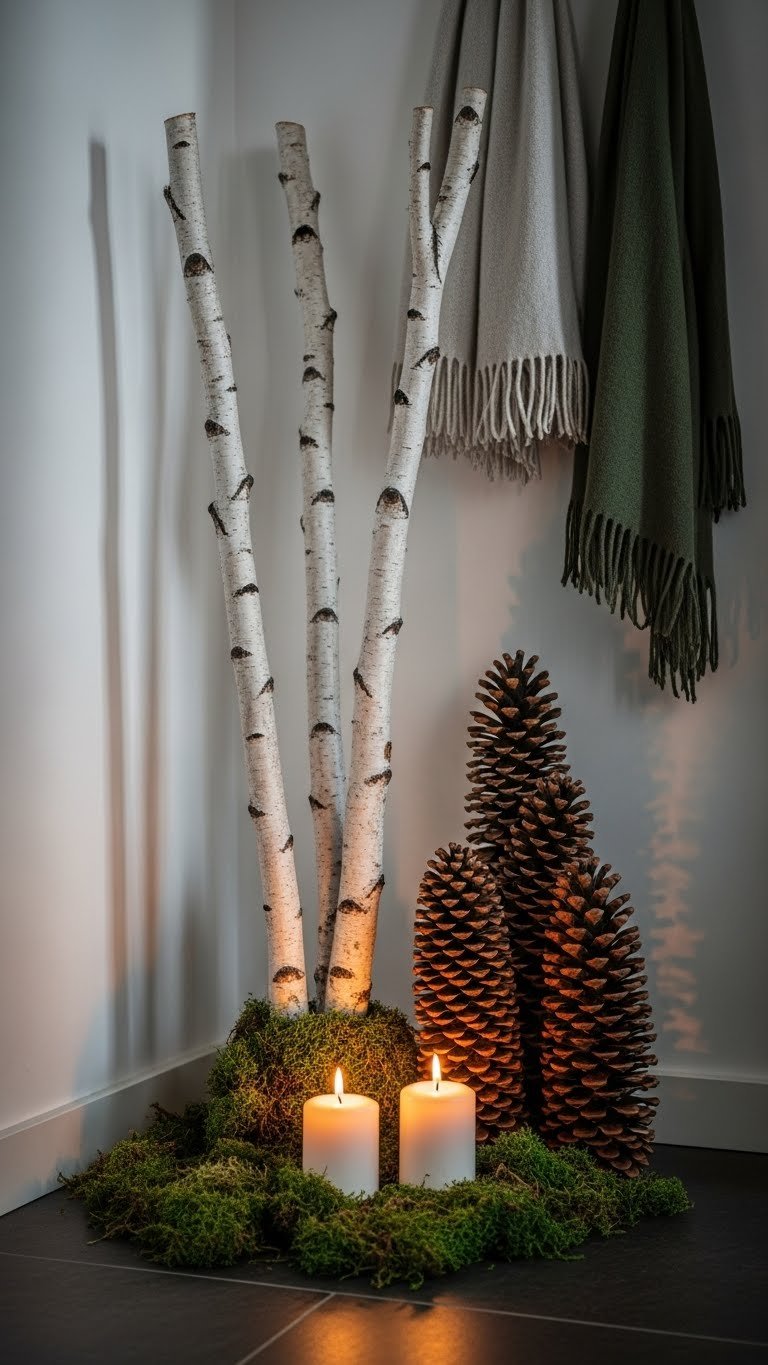 When guests step up to your door, a simple arrangement of birch branches and pinecones sets a modern, cozy tone—clean white bark brings Scandinavian chill while clustered cones add warm texture.
