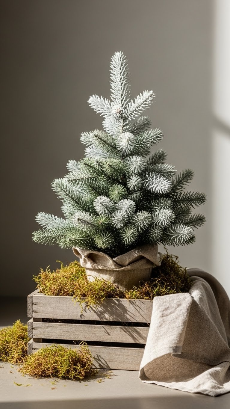 Tuck a flocked mini evergreen into a low wooden crate and you’ve got a fresh, wintry focal point that feels curated not cluttered.