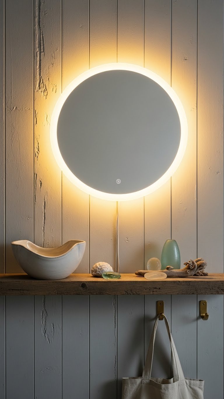 Anchor your entry with a warm-white LED porthole mirror that glows like a soft sunrise, casting inviting light and a coastal-modern edge without overpowering the space. You’ll arrange a small vignette beneath it — a reclaimed shelf, a brass hook, a sculptural bowl — letting the soft halo emphasize textures. The result feels coastal industrial, liberated, and effortlessly chic.