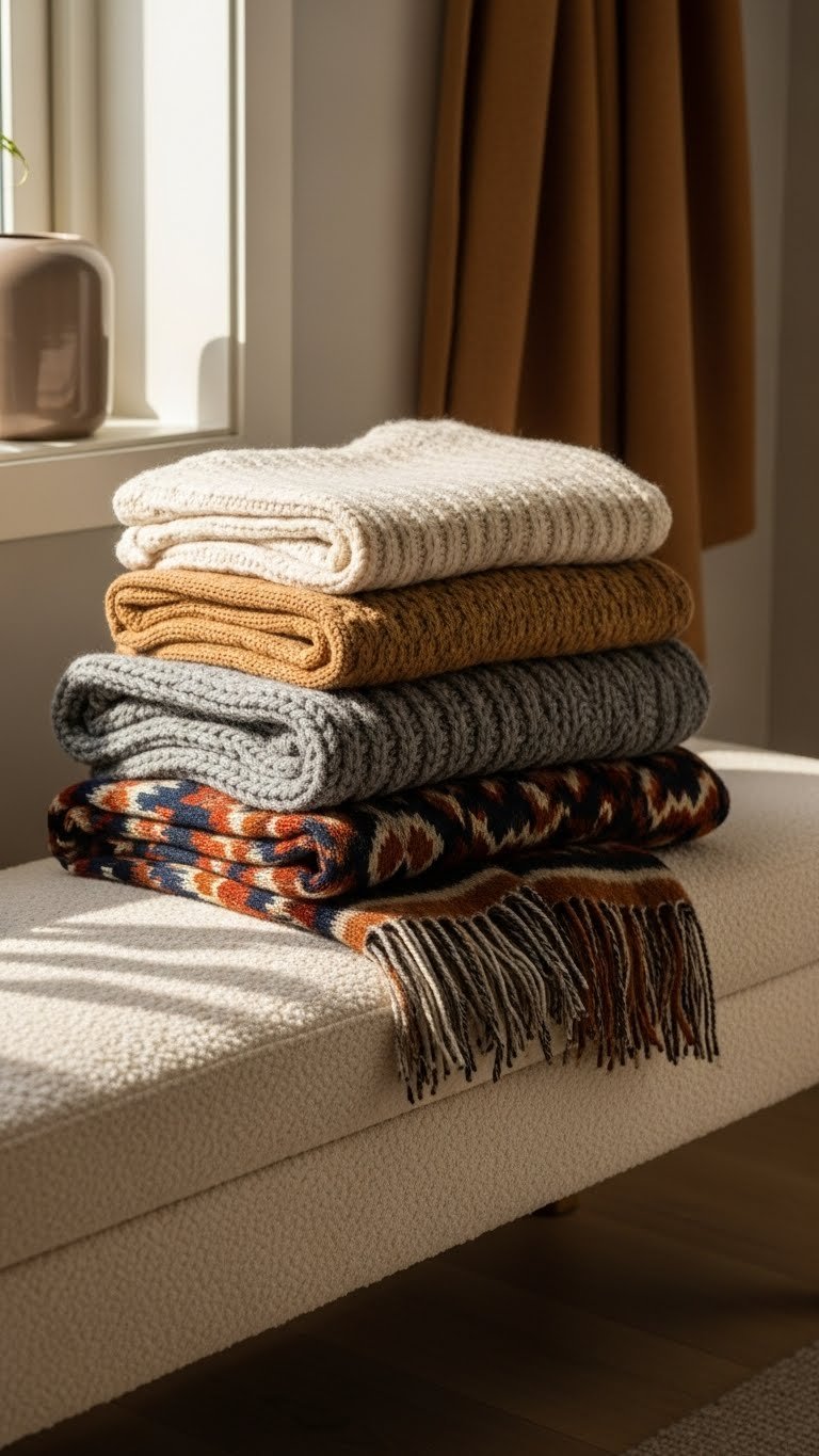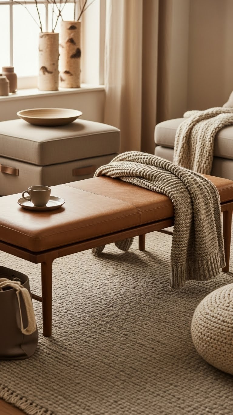 After you’ve set the birch-filled vases, layer in cozy textiles to warm the space: start with a low-profile bench upholstered in natural linen or worn leather, place a textured wool rug beneath it, and toss a chunky knit throw over one corner for an inviting, lived-in edge. Choose neutral colorways, add practical ottoman storage, and mix nubby, sleek, and soft finishes for relaxed polish.