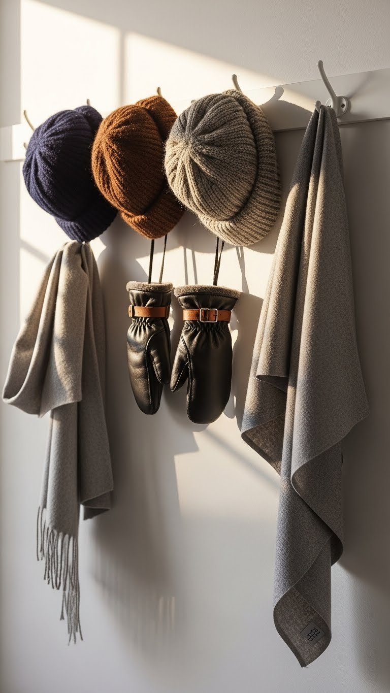 You’ll hang seasonal hats in varied textures, pair a minimalist mitten display with leather straps, and add a sculptural scarf or two.