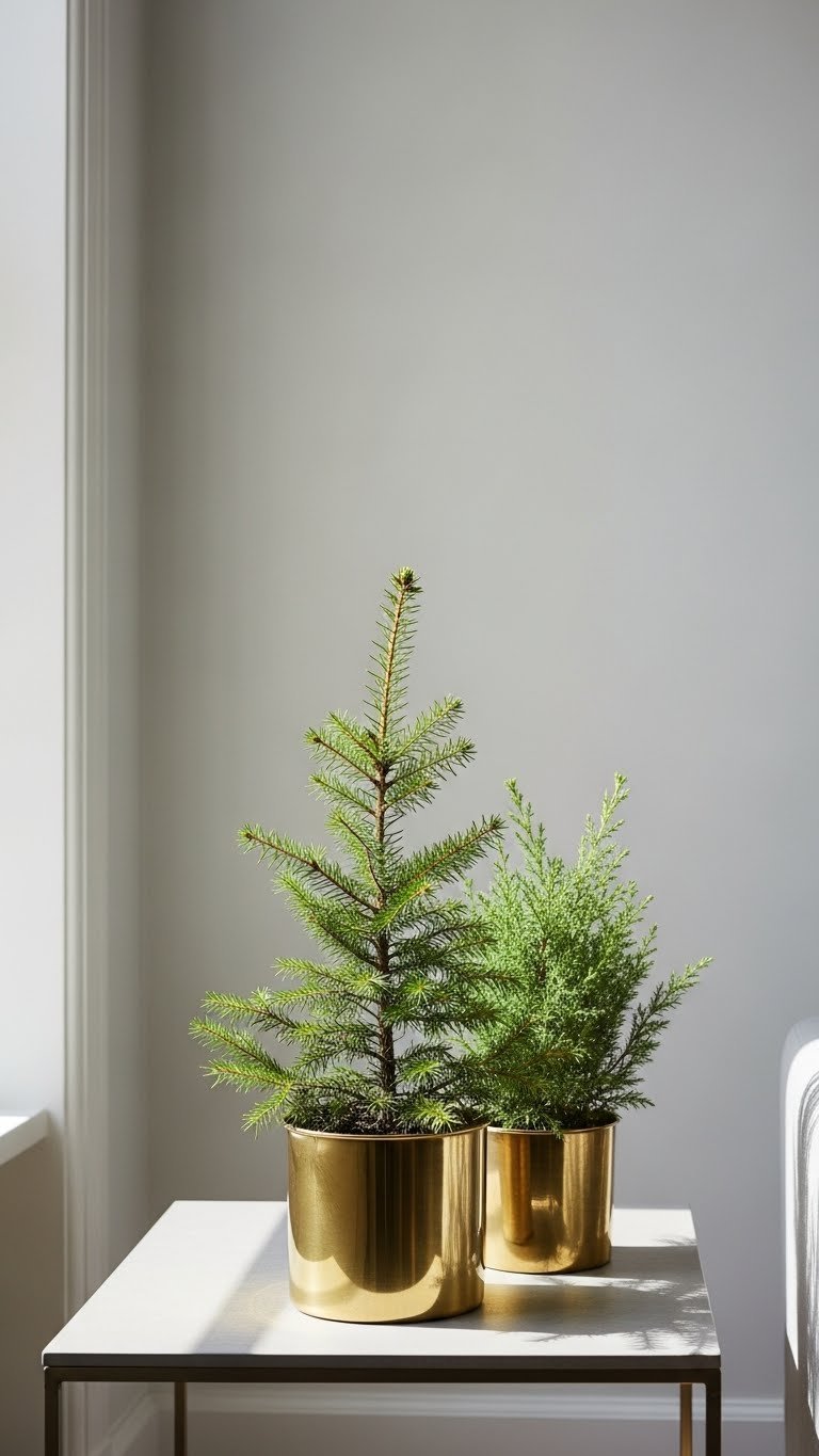 With a trio of small evergreens grouped on a low side table, you’ll create a crisp, modern welcome that feels both seasonal and restrained. Place a mini spruce in a slim brass planter, balance varying heights, and leave negative space so the arrangement breathes. You’ll love how this minimalist cluster reads chic yet effortless, signaling hospitality without clutter or holiday overload.