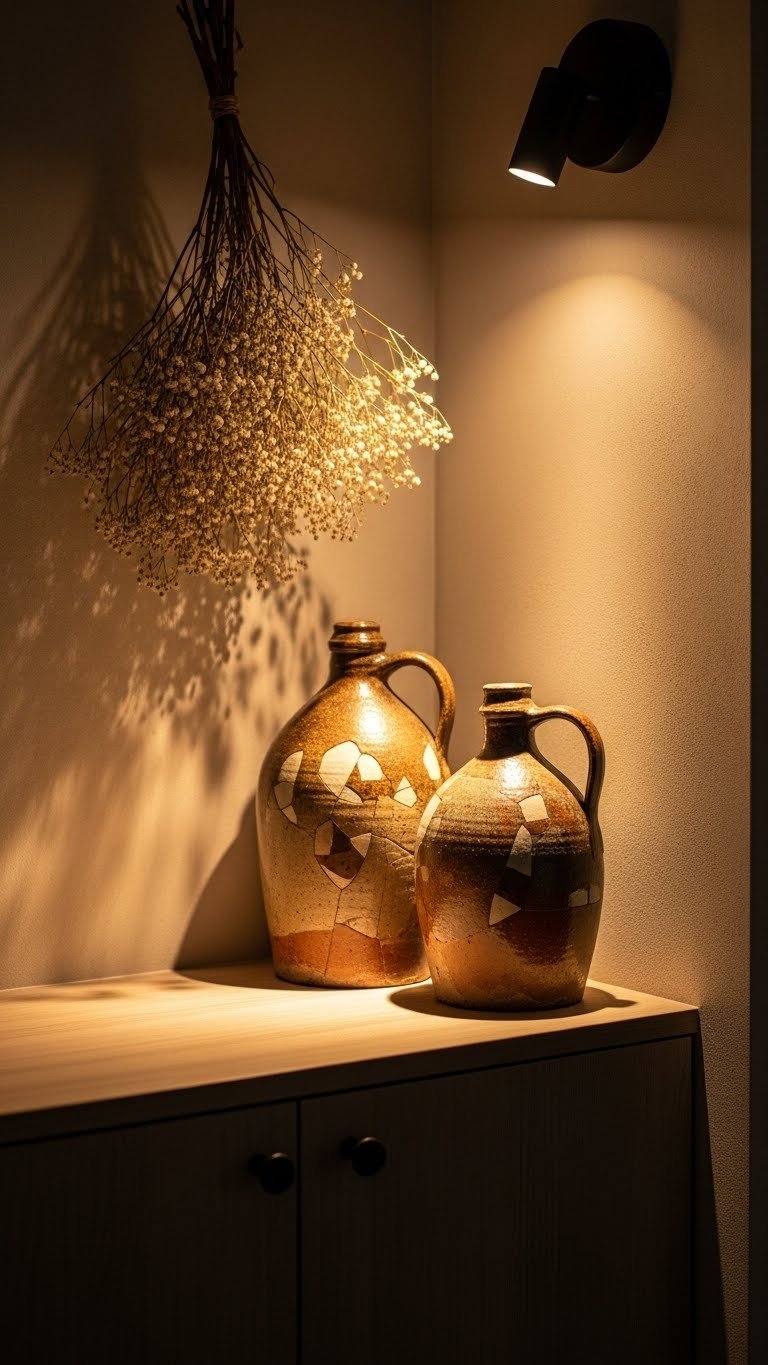 Let the amber glow from your terra-cotta vases spill into a softer, more intimate layer by adding puck lights beneath a console shelf — they tuck out of sight but throw a warm, low beam that lifts textures and creates depth.