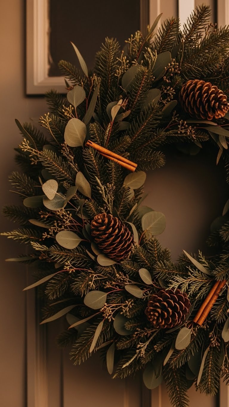 Framed by soft amber light and a quiet winter palette, a mixed evergreen wreath with pinecones gives your entryway an effortless, modern holiday touch.