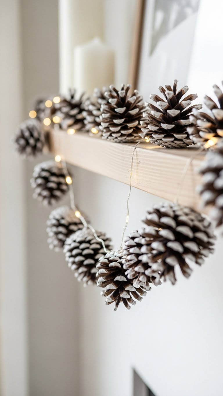 Brighten your mantel with a white-washed pinecone garland that mixes rustic texture and modern restraint. You’ll drape whitewashed garlands along the edge, spacing pinecones for airy rhythm, then add subtle twinkle lights for glow. Keep colors neutral, let wood and cream tones sing, and balance negative space so your mantel styling feels effortless, open, and utterly free.
