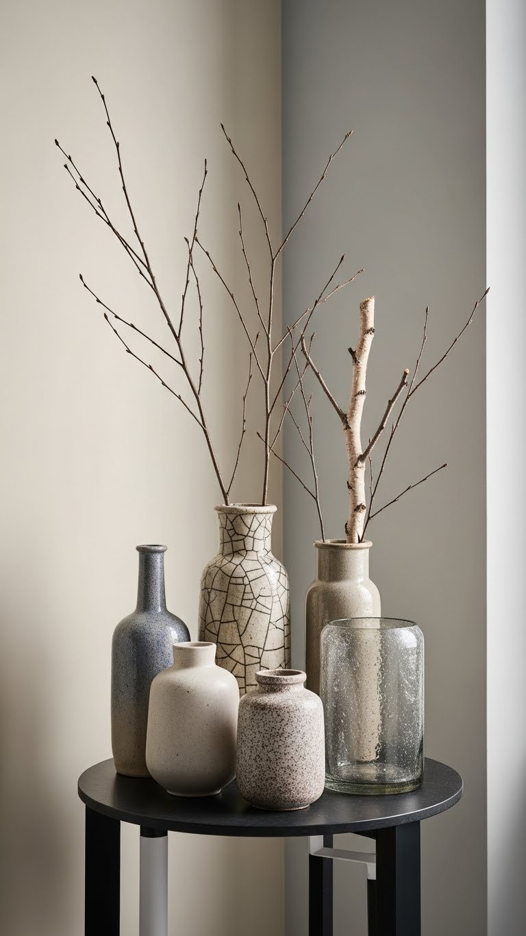 Pull together a quietly stylish winter vignette by grouping vintage vases and filling them with slender birch branches—mixing timeworn ceramics and glass with the branches’ pale, papery bark creates an instant Scandinavian-chic look.