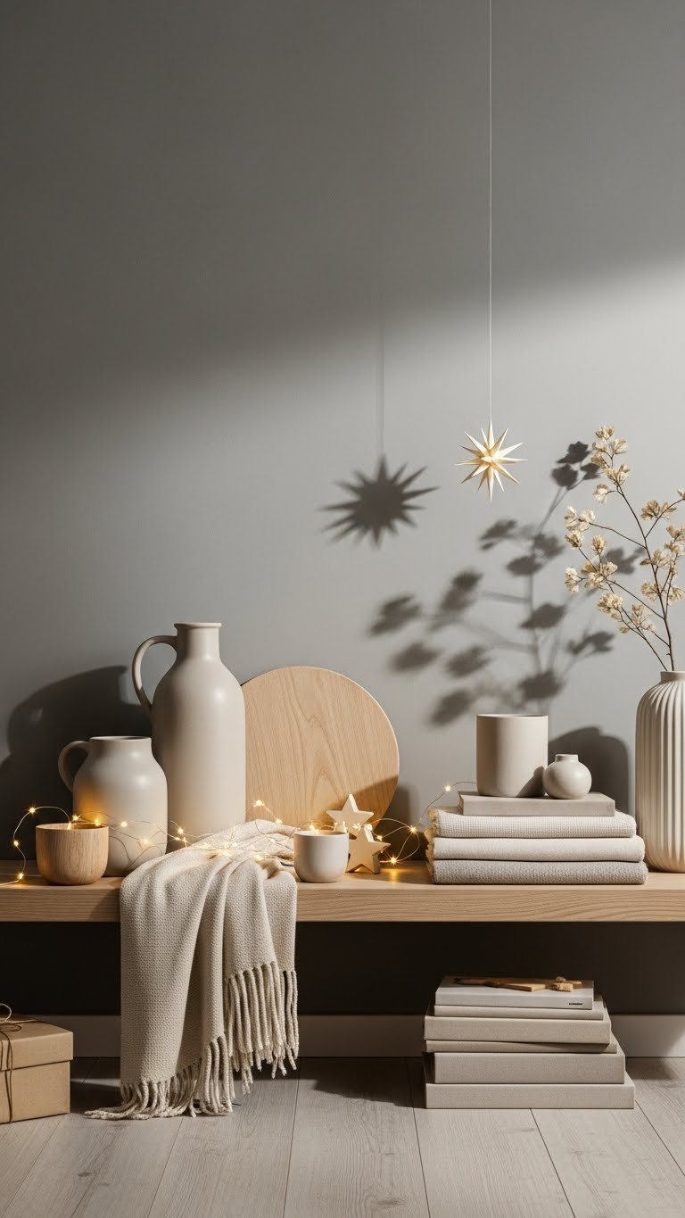 When you want a winter shelf that feels both minimalist and magical, lean into Nordic Starry Charm: start with clean lines, muted tones, and layered textures, then add small, warm lights and star-shaped accents to create a soft, celestial glow.