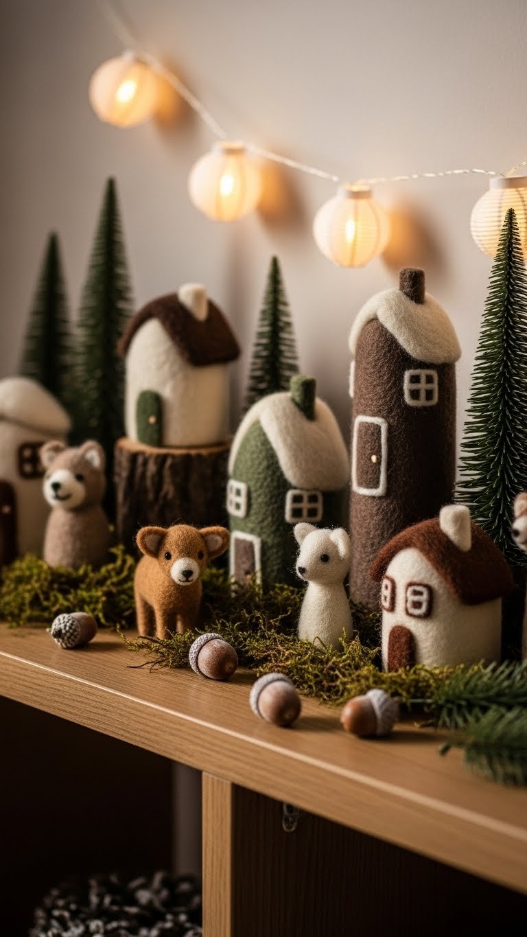 Imagine lining a low shelf with tiny cabins, felted animals, and a string of soft-glowing lanterns to bring a quiet forest scene indoors. You’ll place snowy acorns as accents, stagger toys for depth, and tuck mini pine sprigs to echo forest silhouettes. Keep color muted, textures varied, and negative space intentional so the display feels effortless, playful, and free.