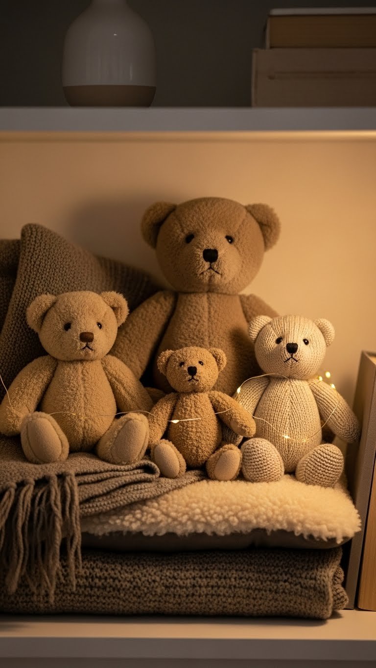 Often you’ll lean into plush textures and cheerful accents to create a Soft Snuggly Cheer Teddy Vignette that invites touch and smiles: group two or three teddy bears of varying sizes and fabrics—think a worn mohair, a velvety plush, and a knit companion—on a small shelf or cubby, nestling them on a folded knit throw or faux-shearling pad, and anchor the scene with a tiny string of warm fairy lights or a miniature garland for a soft, joyful glow.