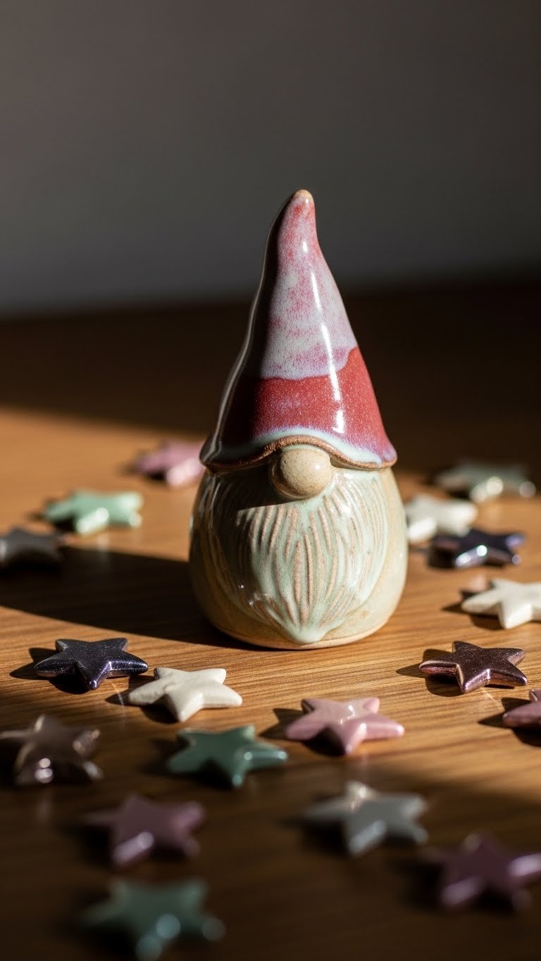 Shift the eye from geometric honeycombs and dense evergreens to a focal pair that brings personality: a small ceramic gnome surrounded by a scatter of star ornaments. You’ll use handmade glazing to highlight ceramic texture, choosing gnome placement for balance and whimsy. Keep star clustering asymmetrical, letting negative space breathe, so the arrangement feels effortless, free, and intentionally curated.