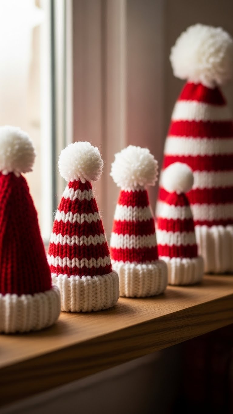 Line up a charming parade of tiny knitted Santa hats to give your shelf a cozy, handcrafted focal point.