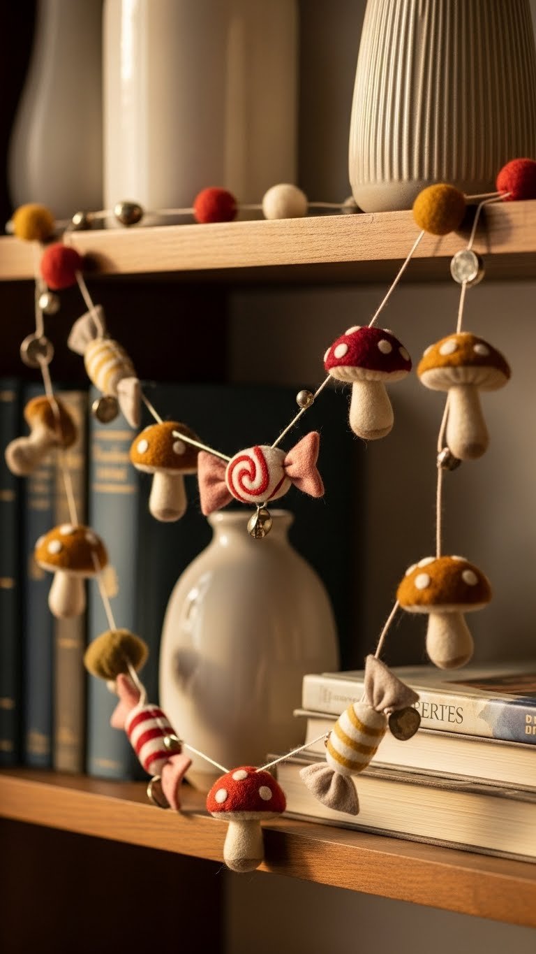 String a whimsical garland threaded with candy and mushroom motifs to give your winter shelf a playful, nature-meets-sweetness vibe. You’ll mix vintage candy charms, felt mushroom motifs, and metallic accents for contrast. Hang loosely, vary spacing, and let pieces drape over books and ceramics. The result feels curated, liberated, and effortlessly festive without looking contrived.