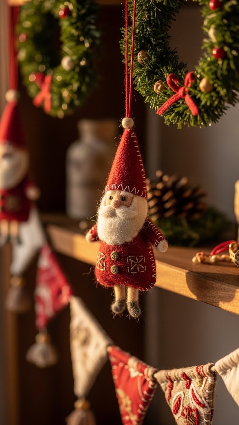 After the playful candy-and-mushroom garland, bring a touch of storybook charm with a felt Santa fairy-tale dangle that feels handmade and heirloom-ready. You’ll hang it among mini wreaths and fabric garlands to create layered, wanderlust-ready vignettes. Choose muted reds, soft creams, and stitched details so the piece reads nostalgic but modern; it invites playful freedom and tactile warmth on your shelf.