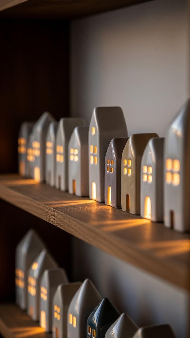 Line up a row of small ceramic houses to bring a quiet, architectural glow to your shelf; they’ll read like a miniature village at dusk, each one casting soft pools of light through cut‑out windows. You’ll choose matte glaze finishes for subtle texture and pair varied heights for rhythm. The warm glow invites evening calm, letting you curate a liberated, effortless vignette.