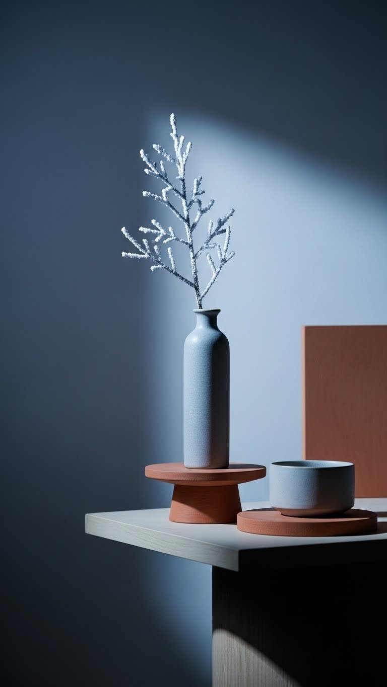 You’ll place frosted branches in a matte vase on a minimalist pedestal, letting a single icy sprig read like sculpture — restrained, liberated, effortlessly intentional.