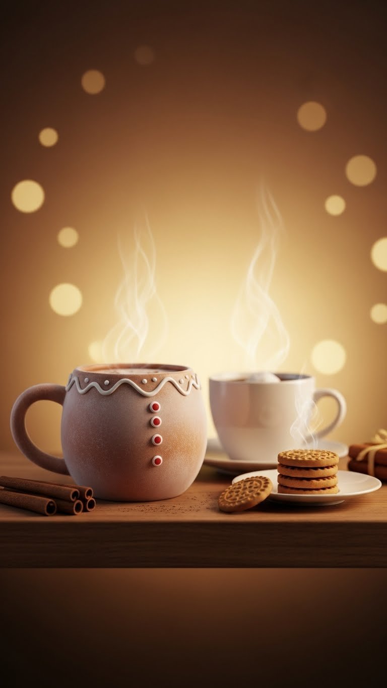 You’ll place a gingerbread centerpiece beside a hot cocoa cup, tuck a mini cookie stack on a saucer, and let cozy steam cues suggest motion — a restrained, liberated nod to homey winter calm.