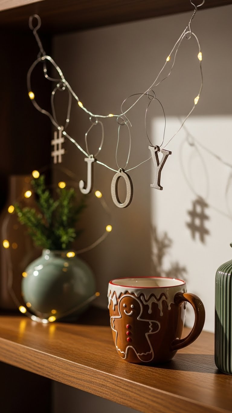 After you tuck the gingerbread mug in place, add a delicate “JOY” garland above or along the shelf edge to lift the vignette vertically and echo the warm mood. You’ll secure it with near-invisible hooks, letting a draped twinkle fall in delicate loops. Position letters off-center for movement, keep spacing airy, and step back — freedom in placement makes the display feel effortless and curated.