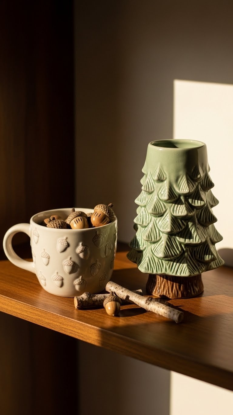 A pair of ceramic mugs—one embossed with little acorns, the other shaped like a miniature pine tree—creates an instant woodland nod on your shelf; place them slightly staggered so the taller tree mug anchors the arrangement while the acorn cup leans in for balance.