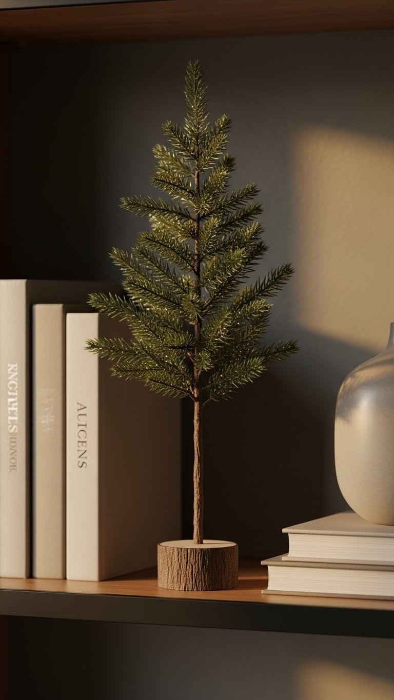 Bring a frosted branch or miniature tree into a slim vase to introduce winter texture and vertical contrast to your shelf; the cool, crystalline finish plays against warmer ceramics and wood, grounding the vignette without fuss.