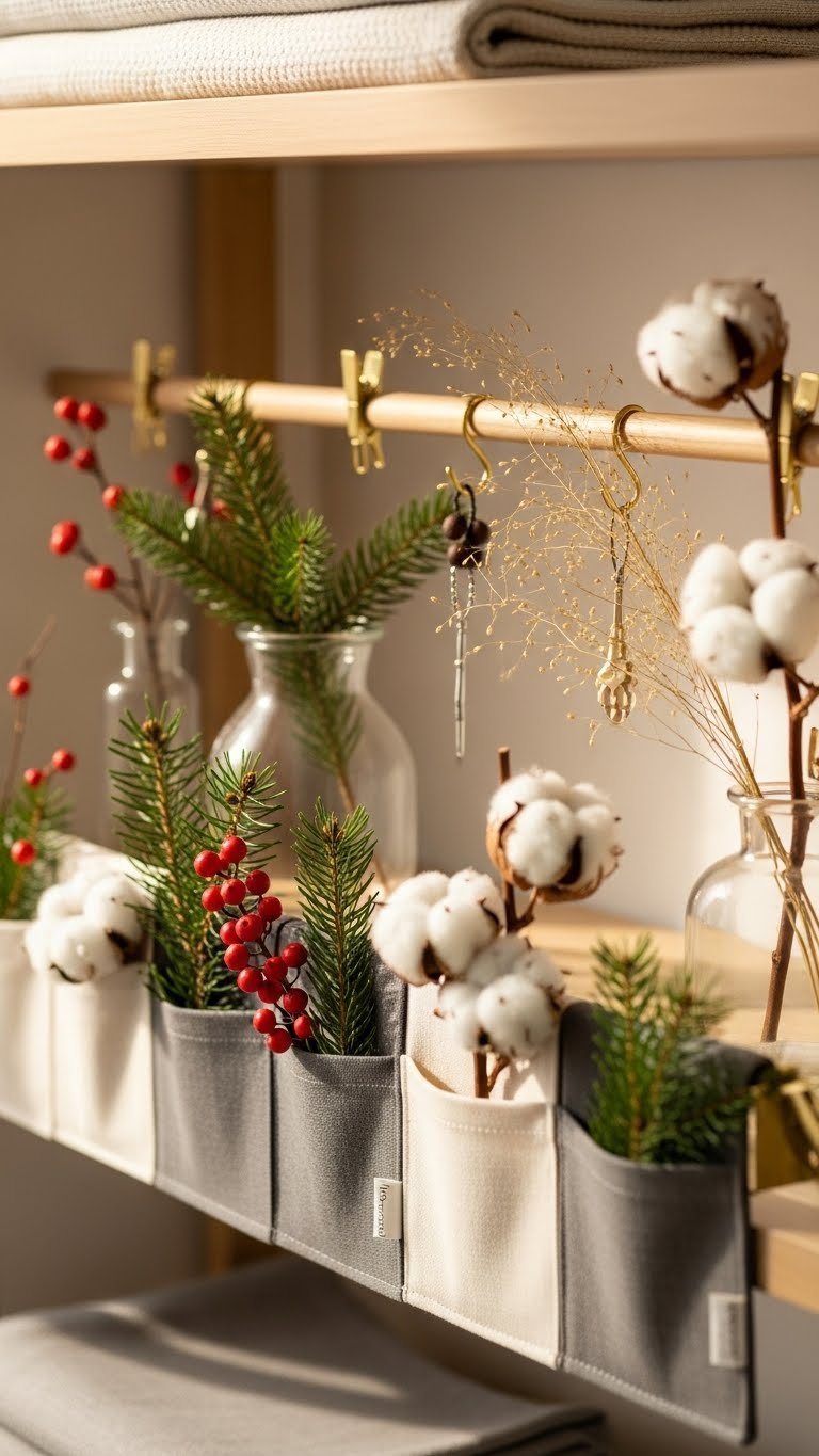You’ll appreciate seasonal swaps that let you shift mood quickly: tuck greenery or berries into fabric pockets, clip lightweight accents with magnetic hooks, or anchor picks in vases for easy removal later.