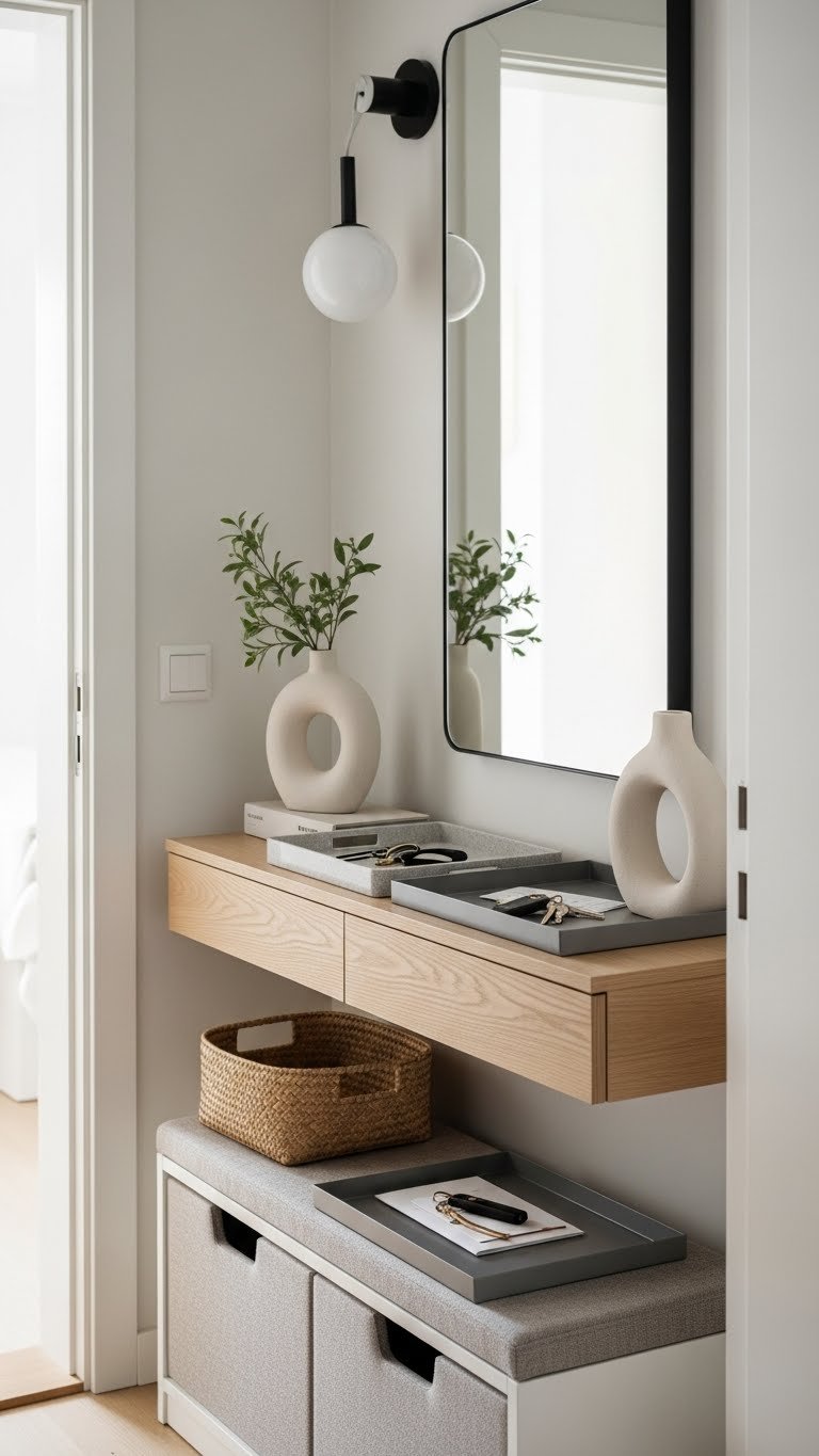 You’ll curate freedom with layered trays for keys and mail, a slim mirror or mirrored accents to amplify light, a small bench with hidden storage, and a single sculptural object for personality.